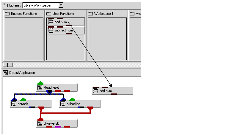 For example, suppose that you start the express process and instantiate the add_num module (from the AVS/Express library Library_Workspaces.User_Functions). The express process creates a user process, in which add_num runs. You then instantiate subtract_num (located in the same library), which runs in the same user process as add_num. Now, you delete both subtract_num and add_num. Since the user process now contains no modules, it is no longer needed and is deleted. If you instantiate add_num again, the express process creates a new user process for it.