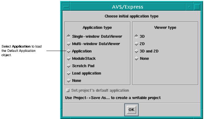 Note: If you want AVS/Express to load DefaultApplication at start-up without displaying the initial application dialog, set the toggle Set Project's Default Application.The next time you load this project, AVS/Express will use DefaultApplication as the default without querying you for an initial application.