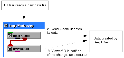 For example, consider the data visualization application consisting of Read Geom connected to Viewer3D. Say you or your end used decides to read a new data file. This causes Read Geom's data to change. Viewer3D, through its connection, is notified of the change. The notification causes Viewer3D to execute and render the new data: