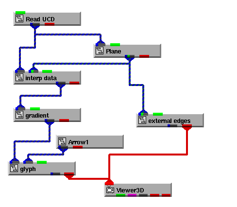 - The Arrow1 geometry is creating the arrows. They are sent to glyph, which produces a copy of the arrow at each node in the input field. glyph's vector parameter is turned on, so the arrows are rotated to reflect the vector at each node.