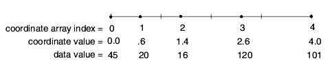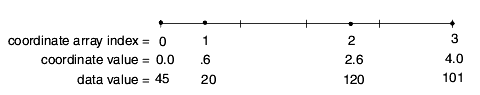 - describes a log-spaced three-element X axis with nodes at 4, 8, and 16, and a linear four-element Y axis with nodes at 1, 2, 3, and 4 in a 2D space. If the desired space (nspace) is 3D but the computational grid is 2D, the Z values of the points must be constant.