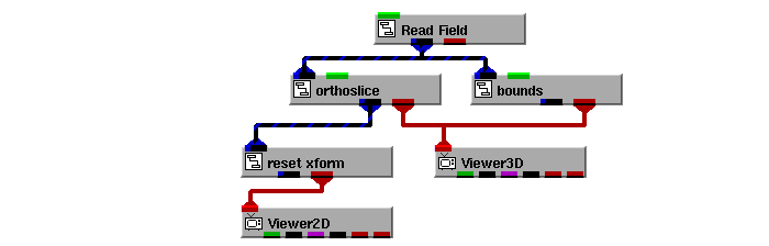 The figure below shows the case where an additional Graphics Display Kit object has been introduced into the hierarchy. This allows the orthoslice to be rendered as a 3D mesh in the 3D view and as a image in the 2D view.