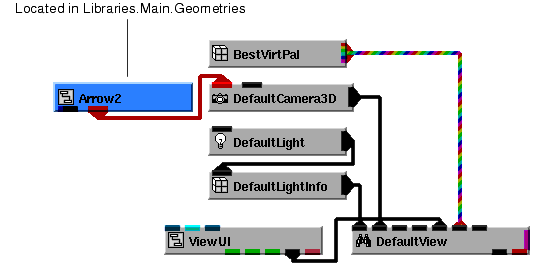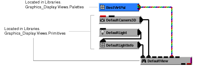 - Instance into the DefaultApplication workspace the following objects: DefaultCamera3D, DefaultLightOn, DefaultLightInfo, DefaultView, and BestVirtPal. Then connect them as shown in the diagram below.