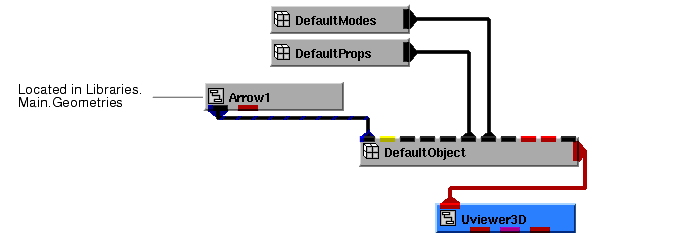 Finally, we need to supply the Graphics Display Kit with an object to render. We can do this with Arrow1. It makes the data available both as a field (first output port) and as a Graphics Display Kit object (second output port), ready for rendering. We use the second output port.