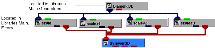 - Instance Diamond3D and scale (four copies), then connect them together and to UViewer3D, as shown in the diagram below.