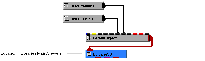 Here is what the definition of a Graphics Display Kit object looks like, at the base-type level. Most of the base types defining a Graphics Display Kit object are optional. In the diagram, the object is connected into Uviewer3D, a macro that defines a full-featured renderer, including a view and a rendering window.