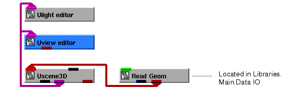 - Instance Uview_editor and Ulight_editor, then connect them to the other objects, as shown in the diagram below. When the editors are instanced, the UIcmd contained in the editors is automatically installed on the Editors pull-down menu.