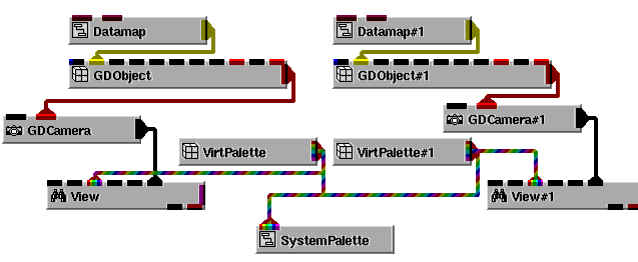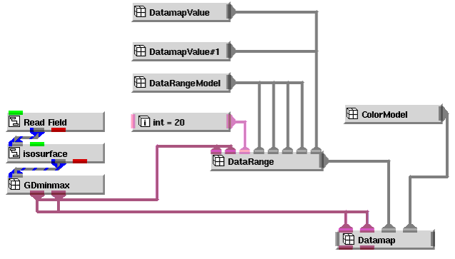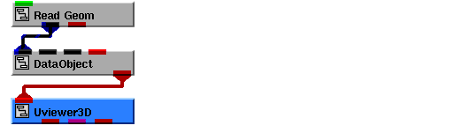 The Data Visualization Kit's readers, geometries, filters, and mappers supply their output both as field data (first output port) and as a Graphics Display Kit object (second output port). Inside these macros, the Graphics Display Kit object is created with DataObject, and thus includes the default datamap.