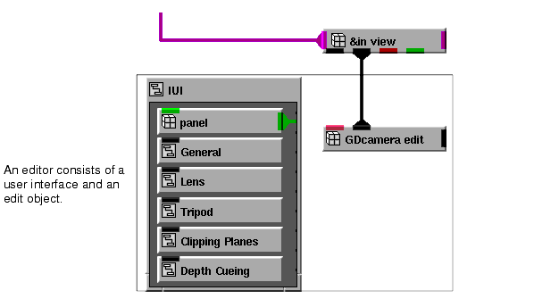 - Parameters used to update the base object- For example, DefaultCamera3D has a subobject from[3]. GDcamera_edit has subobjects from_x, from_y, from_z. You connect the editor's user-interface widgets to these subobjects.