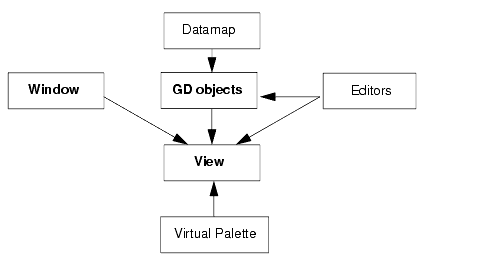 A Graphics Display Kit application consists of several interacting parts. An application has, at minimum, one or more Graphics Display Kit objects, a view, and a window. Keep the following "big picture" in mind:
