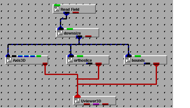 The Read_Field module reads data into AVS/Express. In the network above, the Read_Field module reads data stored in a file in AVS Field file format. The output of Read_Field (the data read in from file) is then passed into the downsize module which subsamples the data.