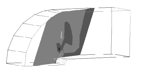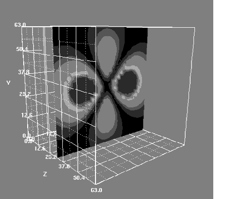 For example, an aerospace engineer with a large collection of data describing air flow over an airplane wing might want to look at values such as density and momentum for different slices of the data set. In this manner, values could be observed at different locations within the volume. A visualization technique supported by AVS/Express called slice allows you to examine slices of a volume of data in this manner. Using slice on air flow data produces the following picture: