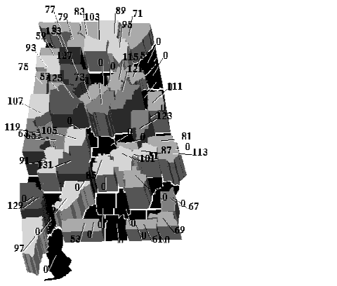Using AVS/Express, it is possible to draw a map of the area with boundaries by county and "pop-up" (or extrude) the different areas to different heights depending on the number of loans made in the area in the last six weeks. In the following example, the regions are colored with the same data used to produce the heights (number of loans). However, color could be used to represent another variable, such as the average amount of the loan. For example, red could correspond to loans of a million dollars or more, blue to loans of $100,000 or less and colors in between to loans in between those amounts. For loans in Alabama, the resulting picture might look like this: