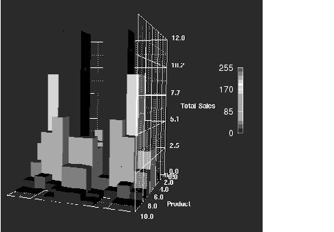 Such a chart could be used to represent sales information. The values along the x axis might represent 10 different territories in your sales region; the values along the y axis, the 10 products in your product line. The height of the bars could represent the total sales for each product in each area and the color of each bar any additional piece of information of interest (the average income of buyers of the product, for instance).