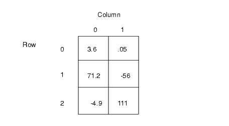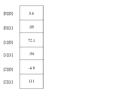 The data values in the array are stored in "row major" order (standard C and C++ order). Thus, an array declared values[3][2] like this