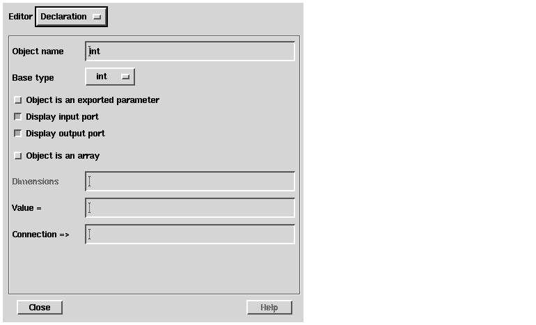 - Use the Declaration page to edit the object's name and reference mode or base type, to specify that the object is an exported parameter, to display input or output ports, and to declare the object an array and set its dimensions.
