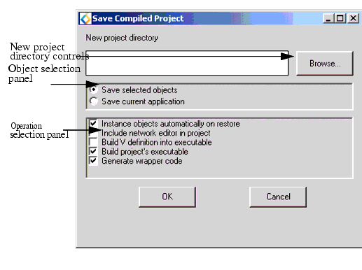 6. Select the Project-Save_Compiled_Project... pulldown menu entry. Specify a new project directory, and turn off the toggles labeled "Instance objects automatically on restore" and "Build project's executable". Then select the dialog's OK button. We only want to create the source code files (.cxx, .c and .h) and the binary v file (.vo).